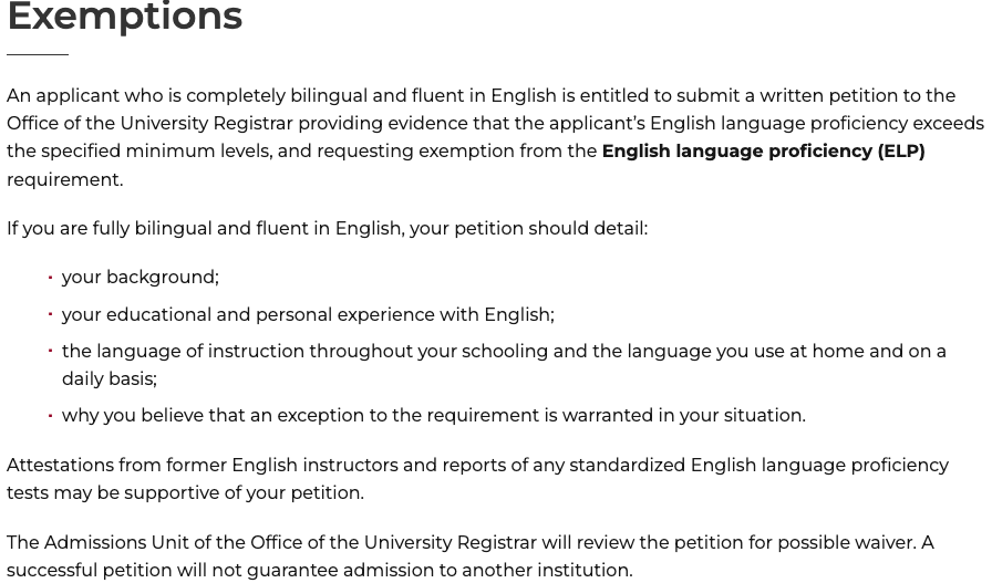 여러 종류의 영어 시험이 있지만, 아이엘츠는 2년 안에 받은 점수여야 하고, 아카데믹 모듈로 오버롤 6.5 리스닝, 스피킹은 7.0 이상 리딩 라이팅은 5.5 이상이다. 신기하게 내가 5월에 알아보고 있을 때는 더 높았는데 그새 점수를 내렸다. 이외에 토플, 셀반, PTE 등등도 있으니 참고하기 바란다. 그러면 나도 그렇고, 나랑 같이 수업 듣는 사람들은 영어점수를 냈을까? 정답은 노! 거의 아무도 안 낸 것 같다. 바로 ELP Exemption이 있기 때문이다.