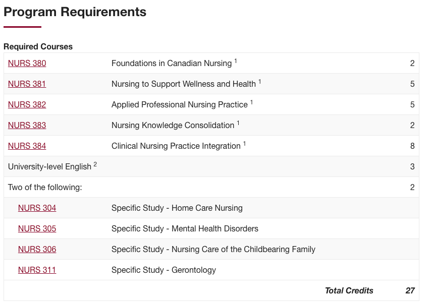 9월부터 12월까지의 Fall 텀에는 NURS 380,381 (LECTURE+LAB), ENGLISH 총 10 크레딧을 듣고, 1월부터 4월 윈터텀에는 NURS382(Lecture+lab),383 (lab), 그리고 온라인 코스인 304,305,306,311중에서 2개 선택해서 총 9 크레딧을 듣는다. 마지막으로 5월과 6월 사이에 8 크레딧 과정인 NURS 384 즉 실습을 하게 된다.