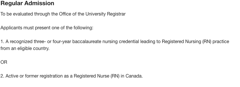첫 번째로, CRNA에서 인정하는 나라에서 3~4년의 간호대학을 나왔다. 여기서 인정하는 나라라는 건 보통 영어로 수업이 이루어지는 나라를 뜻한다. 예를 들어 Philippines, India, the United States, the United Kingdom, Australia, Nigeria, Jamaica, New Zealand and Ireland ,, 요런 나라들.. 눈 씻고 봐도 우리나라는 없다는 거.. 그래서 당연히 우리 반에 한국인은 나밖에 없다. 듣기로는 이번해에 맥이완에서 이 브리징 프로그램을 듣는 사람들이 160명 정도 된다고 한다. 한 반에 40명 정도씩이나 4반이라는 건데, 다른 반은 나도 모르겠지만 암튼 우리 반을 보면 대략 26명이 필리피노, 캐나다(백인) 5명, 인도 4명 흑인(나이지리아, 자메이카) 4명 태국 1명 한국 1명 뭐, 이렇다. 위의 나라들은 영어를 숨 쉬듯 말하는 나라인데 나같이 영어 때문에 매일이 힘든 사람이 여기 껴있느라 참 고생이 많다. 암튼 나 같은 경우는 위의 나라에서 대학을 안 나와서 될지 안 될지 모르겠었던 차에 보니, 캐나다에서 RN 등록을 했었으면 또 신청가능하다 그래서 바로 알버타 RN 등록증을 보냈더니 바로 오케이 했다.