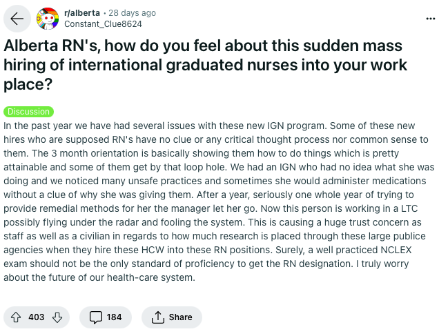 나도 IEN이고 이 파일럿 프로그램 때문에 엔클렉스를 보게 된 케이스라서 이 프로그램에 긍정적이고 감사한 마음이 크지만, 필드에서 일하고 있던 널스들은 장롱면허 가지고 있다가 갑작스럽게 RN이 되어 일하게 된 IEN들을 좋게 보지 않는 사람들도 꽤 되었다. Reddit에 누군가 올려놓은 이 파일럿 프로그램을 통해 앨버타 RN 이 되어 일하게 된 IEN에 대한 discussion을 읽게 되었는데, 부정적 의견들이 대부분이었다.