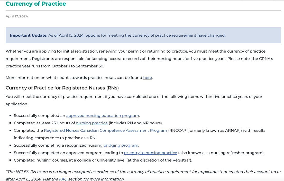 나는 NCLEX 후기를 적은 글에 언급했듯이 NCLEX RN 을 뉴욕보드로 2024년 3월 15일에 보았고, 합격을 하였다. 4월 초 당시, 아직 뉴욕에서 면허증도 안 날아왔었기 때문에 좀 더 있다가 할까 말까 망설이다가 4월 8일에 CRNA에 어카운트를 만들고 Jurisprudence exam, identity check, criminal record check 등을 거쳐 마지막 단계인 Alberta RN 등록비를 낸 건 4월 11일이었다. 그러나 뉴욕주에서 CRNA에 디렉트로 내 면허 정보를 보내줘야 해서 이 부분만 해결이 안 된 상태로 아직 Permit은 나오지 않았고 보류 중이다. 그러던 중에 4월 15일에 더 이상 NCLEX는 받아주지 않는다는 얘기가 들려와서 홈페이지에 들어가 확인했더니 아래의 글이 올라와 있었다.