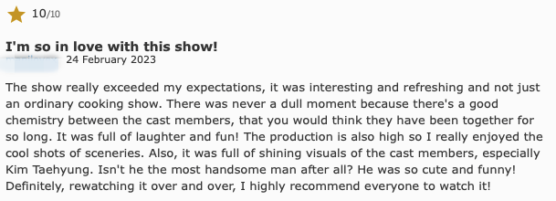 "이 쇼는 기대이상이다. 그냥 보통의 쿠킹쇼가 아니라 재미있고 신선하다. 캐스트들 간의 케미스트리가 좋아 지루한 순간이 없다. 주변경치도 보기 좋고, 멤버들의 반짝이는 비주얼이 좋다. 계속해서 또 보고 또 본다. 모두가 봤으면 좋겠다!"