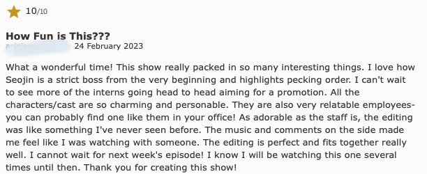 "이 프로그램은 재미가 가득하다. 서진이가 엄격한 사장이 된 것도 좋고.... 모든 캐릭터들이 매력적이다. 전에 볼 수 없었던 편집이다. 음악과 자막으로 딸린 코멘트들 덕에 누군가랑 같이 보는 것 같다. 다음 에피소드 기다리는 게 힘들다. 이런 쇼를 만들어줘서 고맙다."
