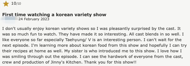 "이 쇼는 이제 막 시작했는데, 모든 사람에게 편안한 쇼가 될 것 같은 느낌이 든다. 보는 내내 웃을 수 있고, 캐스트들 간에 친한 것도 좋고, 어메이징 한 음식도 있다.. 10점 만점에 10점으로 추천한다. 이서진은 돈을 좇지만, 여전히 그의 직원을 챙기는 완벽한 CEO다. 그가 웃어대거나 실실거리는 건 못 봤지만 너무 귀엽고 보고 있으면 마음이 따뜻해진다. 우리 정유미 이사는 너무 예쁘고 완벽한 요리사이고 나는 그녀가 40세라는 걸 아직도 못 믿겠다. 박서준이랑 우식이는 리얼리티쇼에 딱 맞는 사람들인 것 같다. 둘은 장난도 치고, 재미있는 일들을 하곤 한다. 우리 막내 김태형은 항상 긍정적이다. 그의 미소는 마치 치료제인 것 같다."