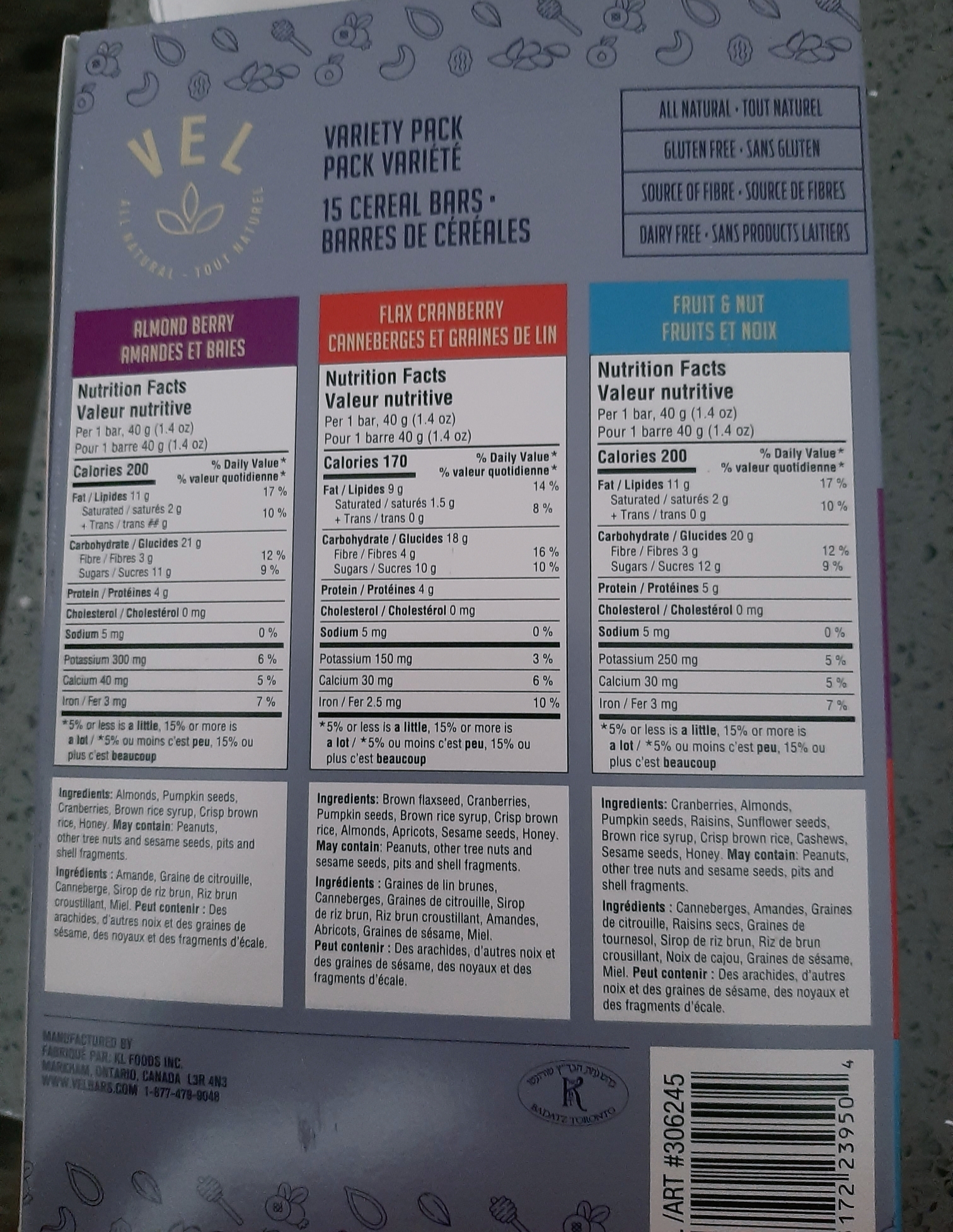 견과류가 듬뿍 들어가고 초콜릿이나 캐러멜이 들어 있지 않은 남편이 먹을 간편한 아침대용 에너지바를 찾고 있었는데, 이 Vel bars를 코스트코에서 찾았다. 알고 보니 코스트코뿐만 아니라 월마트에도 팔고 있는데 코스트코가 더 저렴하다.( 참! 나의 쇼핑리뷰는 순전히 내가 직접 사보고 경험 후 올리는 것이지 다른 의도는 전혀 포함되어 있지 않다.)