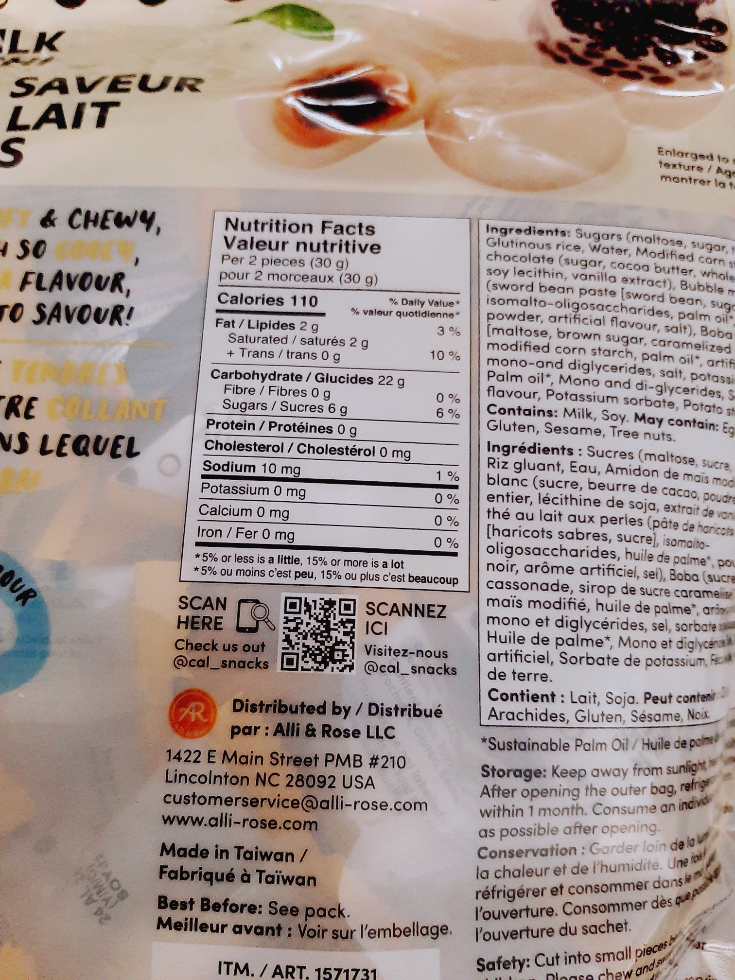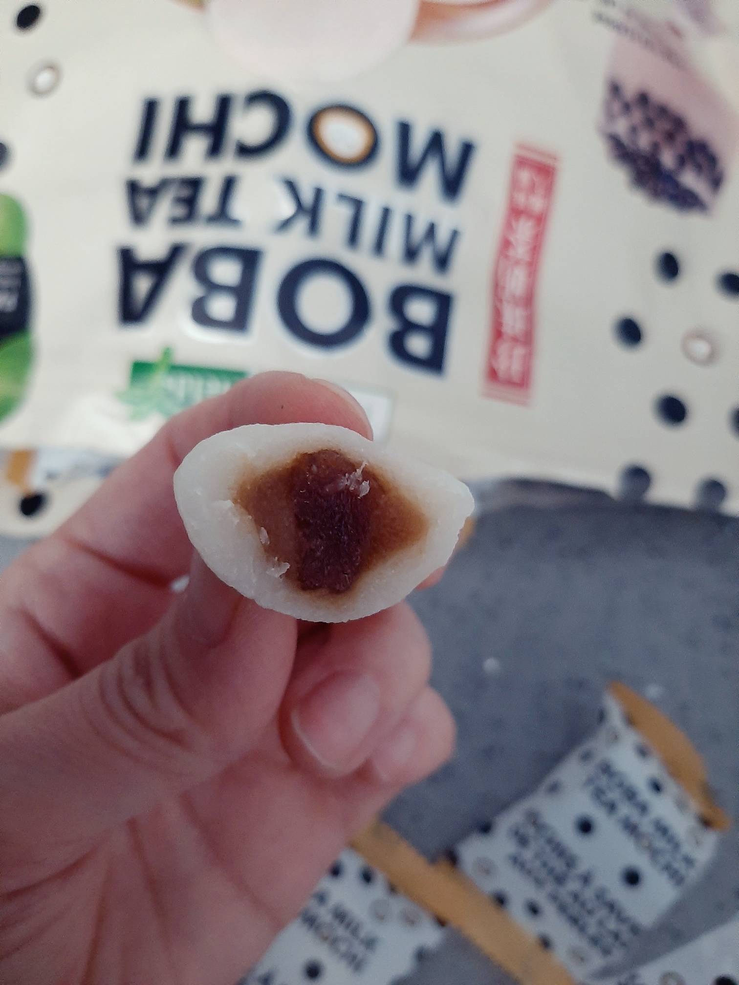칼로리는 두 개에 110이고 트랜스지방은 0프로, 설탕이 6g 포함되어 있다. 타이완에서 만들어진 제품이며, 쌀, 설탕, 코코넛버터, 팥, 팜오일등의 성분이 들어있다. 맛은 한국 찰떡처럼 늘어지는 그 쫀득함은 아니고, 겉은 팥빙수에 들어가는 그 떡느낌이고 안은 밀크티맛이 살짝 나다가 팥맛으로 마무리된다. 밀크티향이 강하지는 않지만 혹 싫어한다면 추천하지 않는다. 한두 개면 모르겠는 데 60개나 들어있으니 처치 곤란할 수도 있다. 그냥 먹어도 맛있지만, 냉동했다가 먹으면 더 깔끔하고 맛있다. 팥빙수에 잘라서 넣어 먹거나 커피간식으로 먹기에도 좋다.