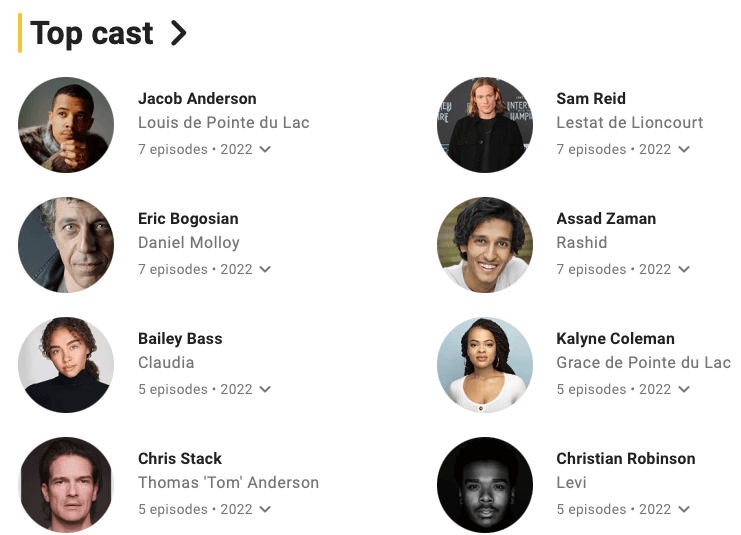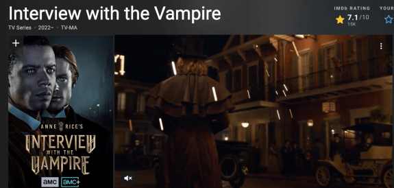 2022년작으로 aMC에서 만들어졌고, 현재 7개의 에피소드로 시즌1이 작년 11월에 방영 완료 되었다. 아마존 프라임 비디오에 aMC 시리즈가 올라와있어서 손쉽게 볼 수 있었다. 기본 골자는 영화에서 가져온 그대로이나 설정이나, 디테일에 변화를 주었다. 브래드 피트가 맡았던 루이스 역할에는 왕좌의 게임에 출연했던 배우 제이콥 앤더슨, 톰 크루즈가 맡았던 레스탯 역할에는 호주 출신 배우 샘 레이드가 출연했다. 드라마는 두바이에서 현시대를 살고 있는 루이즈가 저널리스트 다니엘과 본인의 삶에 대해 인터뷰를 하는 모습으로 시작된다. 1910년 뉴올리언스를 배경으로, 루이즈는 술집 사장 겸 포주로 일하고 있던 어느 날 매력적인 프랑스 남자 레스탯을 만나게 된다. 그러다 너무나 사랑하던 남동생의 갑작스러운 죽음을 겪게 되고 레스탯에 의해 뱀파이어가 되는 게 1화의 줄거리이다. 영원한 소녀 뱀파이어인 클라우디아는 1화에서는 나오지 않았으나, 아바타에 출연했던 베일리 바스가 역할을 맡았다.